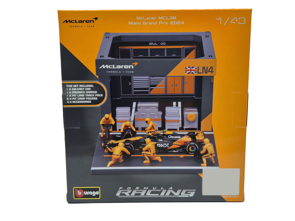 McLaren Pit Stop - boxová dioráma - MCL38 F1 #4 (2024) - Lando Norris - s mechanikmi - Bburago - 1:43 1/43 zberateľský model (m03199)