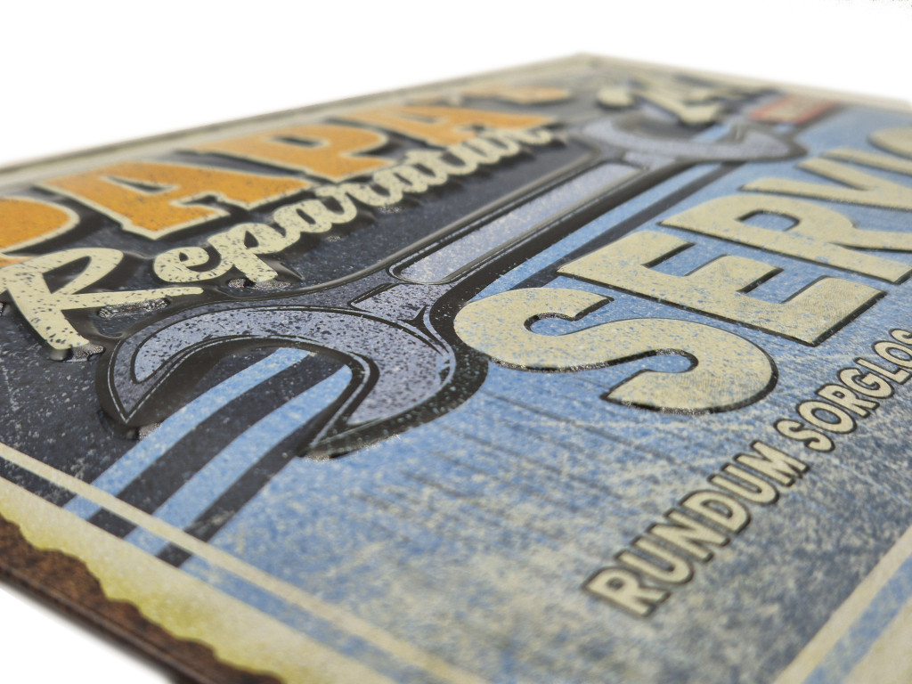 Kovová tabuľa „Papa’s Reparatur Service” prináša do priestoru atmosféru klasickej dielne – miesto, kde sa opravuje, vyrába a tvorí. Vintage dizajn pôsobí štýlovo, originálne a s humorom. Táto tabuľa je ideálnym doplnkom pre garáže, dielne a priestory určené pre hobby majstrov a mechanikov.