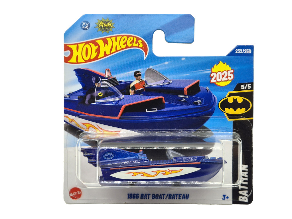 Bat Boat z roku ’66 je legendárne vozidlo z klasického Batman TV seriálu, inšpirované slávnym dizajnom Georgea Barrisa. Miniatúra od Hot Wheels verne zachytáva štýl tej doby a ikonickú podobu vodného vozidla. Skutočná rarita pre fanúšikov DC a Batmana, ako aj pre milovníkov retro filmových vozidiel.