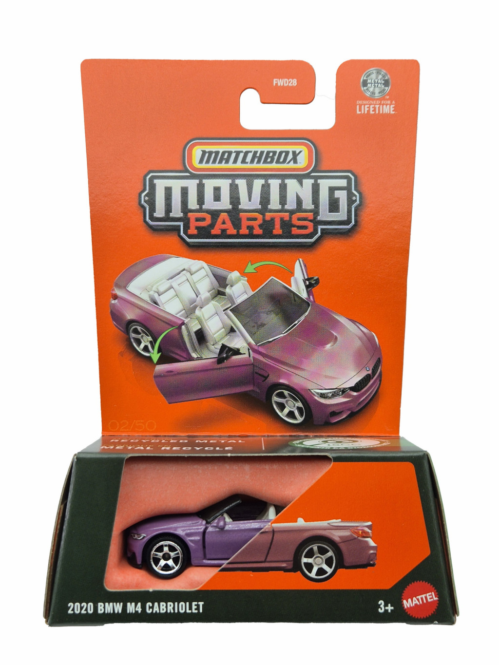 Model Matchbox Moving Parts – BMW M4 Cabriolet (2020) prináša v mierke 1:64 modernú ikonu medzi športovými kabrioletmi. BMW M4 Cabriolet spája výkon typický pre divíziu M s luxusom a slobodou jazdy pod holým nebom. Široký postoj, svalnaté línie a výrazný dizajn okamžite prezrádzajú, že ide o čistokrvný športový automobil.