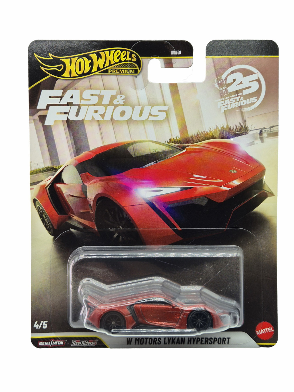 Hot Wheels Premium – Fast & Furious – W Motors Lykan Hypersport prináša v mierke 1:64 jeden z najextrémnejších a najvzácnejších hypersportov zo série Halálos iramban / Fast & Furious, a to v zberateľskej kvalite. Kovová karoséria a gumové Real Riders kolesá mu dodávajú prémiový vzhľad. Futuristický dizajn a raritný charakter modelu Lykan Hypersport z neho robia skutočný zberateľský kúsok.
