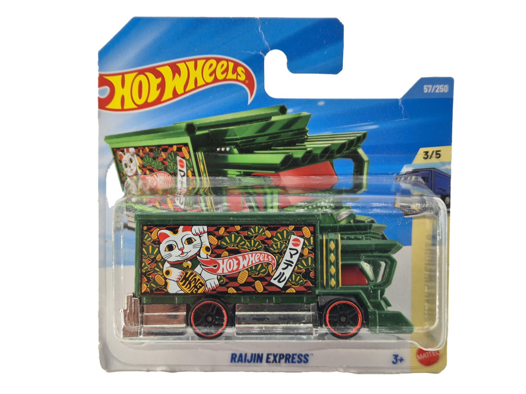 Hot Wheels Raijin Express – HW Heavyweights 3/5 (57/250) je výrazný koncept nákladného vozidla v japonskom štýle v mierke 1:64. Špeciálne riešená kabína a pôsobivé detaily robia tento model skutočne jedinečným. Séria HW Heavyweights sa zameriava na väčšie a robustnejšie vozidlá, vďaka čomu je medzi zberateľmi veľmi obľúbená. Dodáva sa v blistrovom balení a je ideálnou voľbou pre fanúšikov Hot Wheels a netradičných nákladných áut.