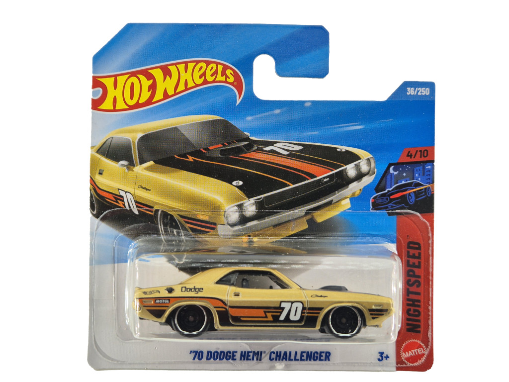 Hot Wheels ’70 Dodge Hemi Challenger – Night Speed 4/10 (36/250) prináša jeden z najznámejších klasických amerických muscle carov v mierke 1:64. Charakteristický tvar modelu Challenger a legendárne dedičstvo motora HEMI mu dodávajú silný, dravý vzhľad. Séria Night Speed sa zameriava na moderný, temný pouličný štýl, vďaka čomu je medzi zberateľmi veľmi obľúbená. Dodáva sa v blistrovom balení a je ideálnou voľbou pre fanúšikov Hot Wheels a muscle carov.