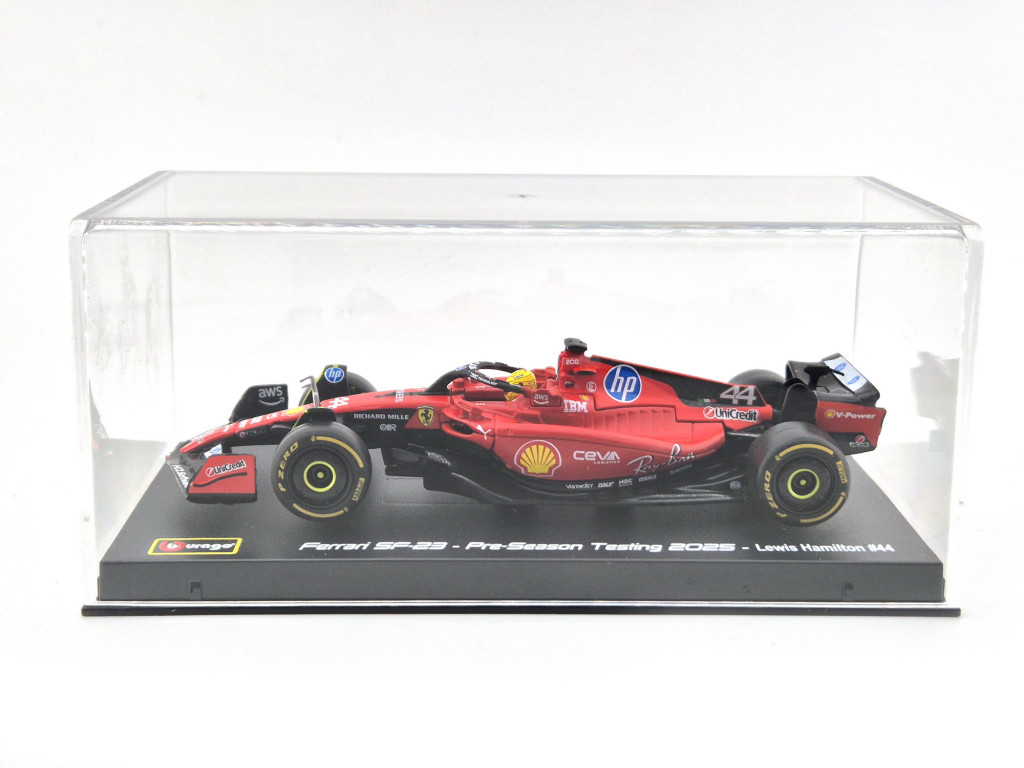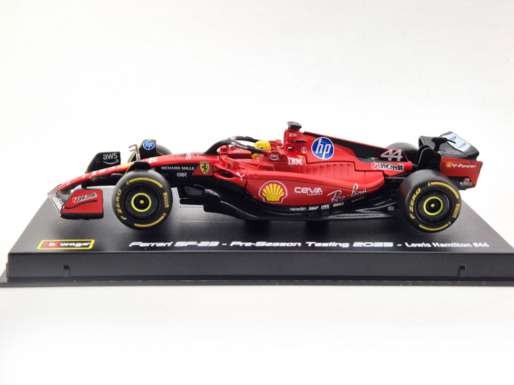 Model Bburago v mierke 1:43 ponúka detailné spracovanie aerodynamických prvkov monopostu SF-23. Charakteristický červený lak, štartové číslo #44 a realistické detaily karosérie sú doplnené o figúrku pilota, ktorá výrazne zvyšuje zberateľskú hodnotu.